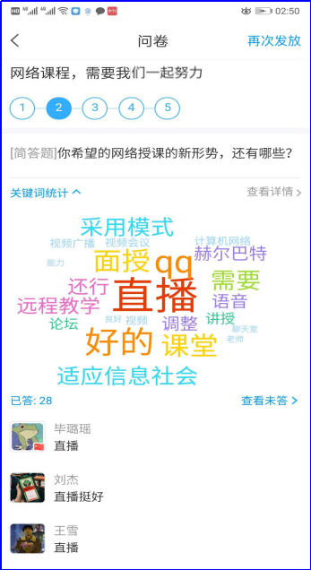 我采取的是建立课程QQ群的方式,通过分享屏幕进行直播,直播分段分点进行,并将教学重点难点实时的传输到聊天区,由于QQ不支持回放功能,因此为了保证学生反复复习,我现在采取的是录屏的方式,直播结束后直接将视频转发到QQ群,这样既能保证课堂的真实性,也便于学生课后复习。